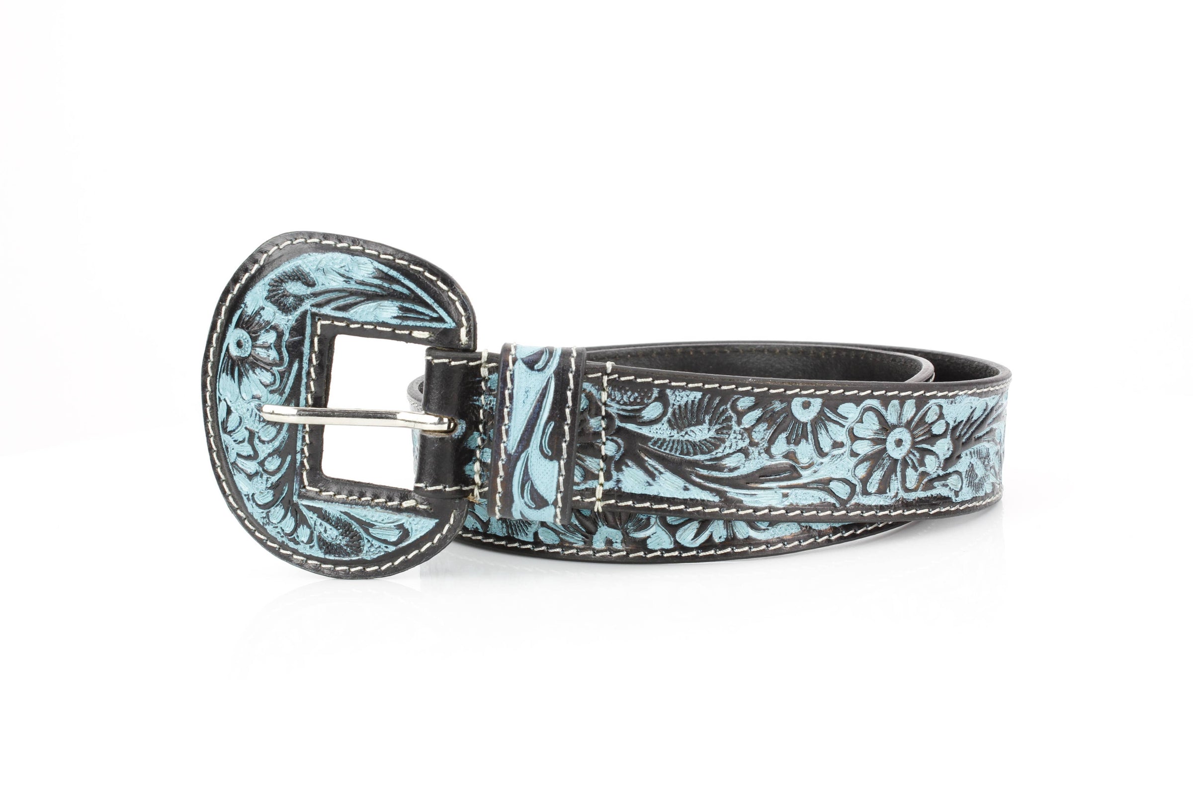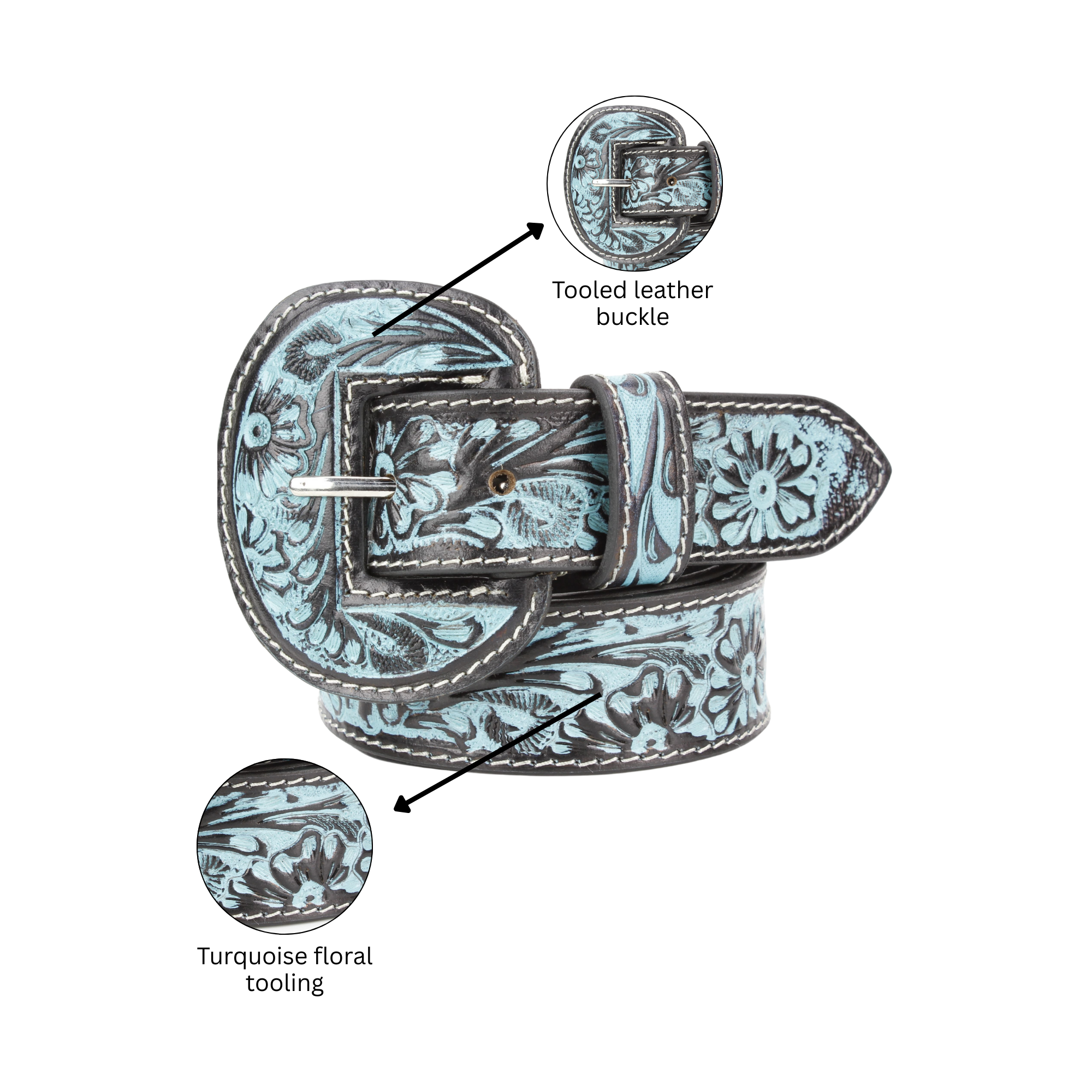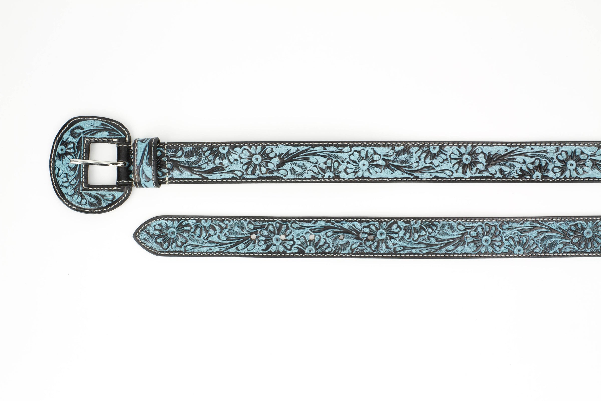 This Western-style leather belt showcases bold craftsmanship and vibrant design. The deep black leather base is enhanced with hand-tooled floral patterns in bright turquoise, creating a striking contrast that stands out. The buckle is fully covered in matching tooled leather with a coordinated floral design, ensuring a seamless finish. Secured with a sturdy metal prong, this belt offers both durability and authentic Western flair. A perfect accessory to add a colorful, statement-making touch to any outfit.