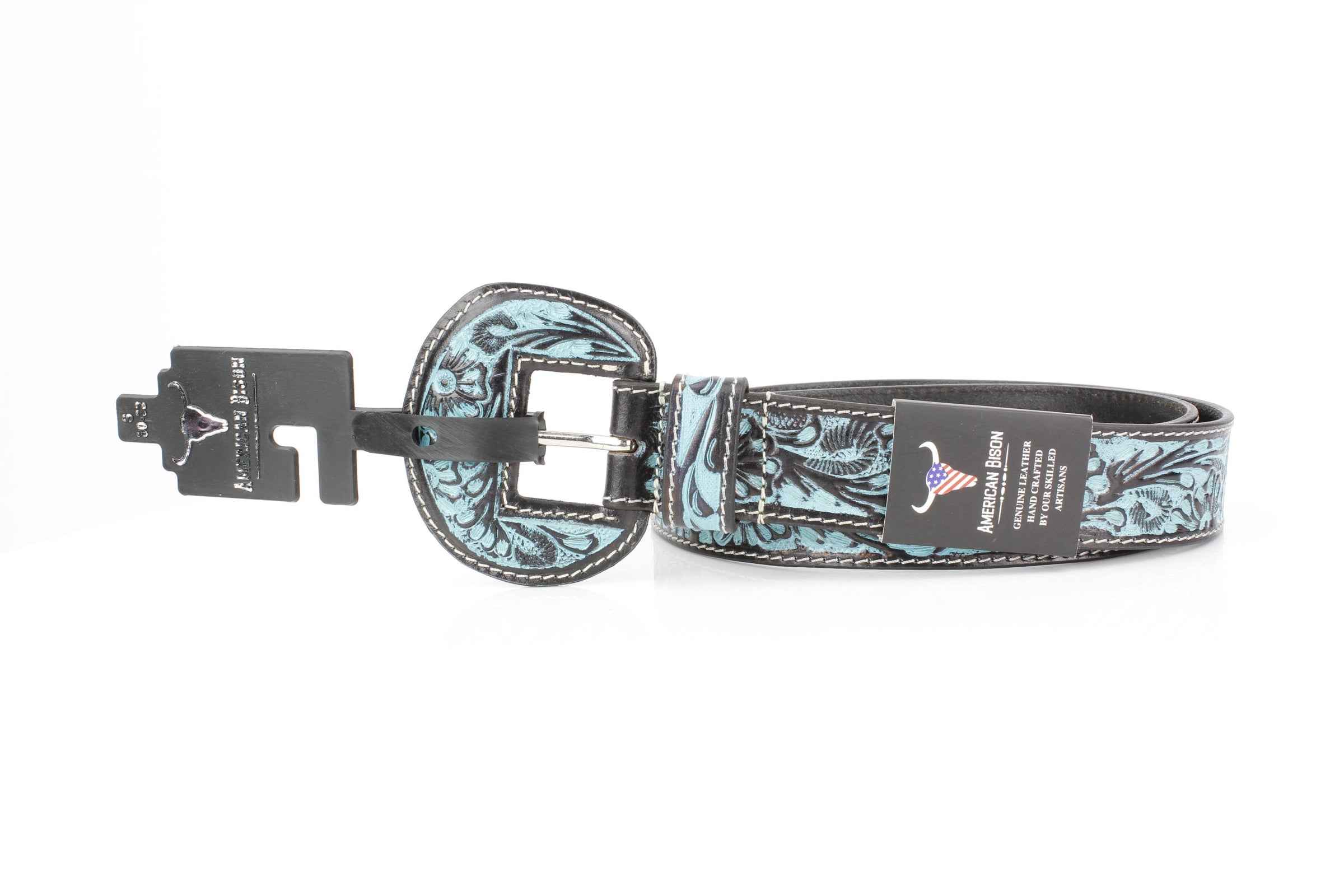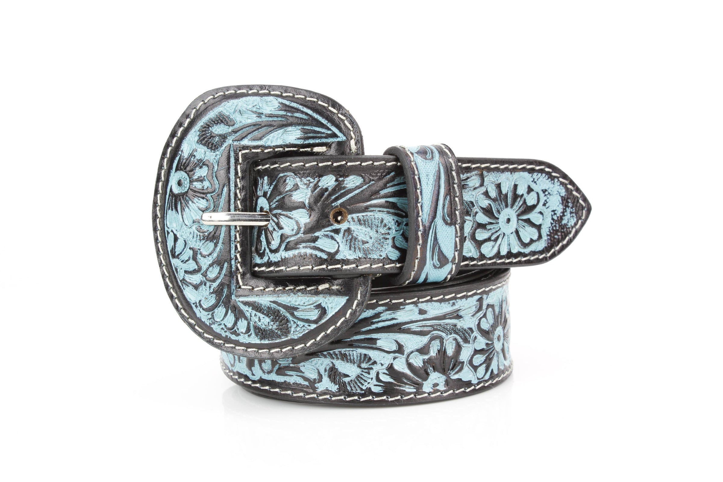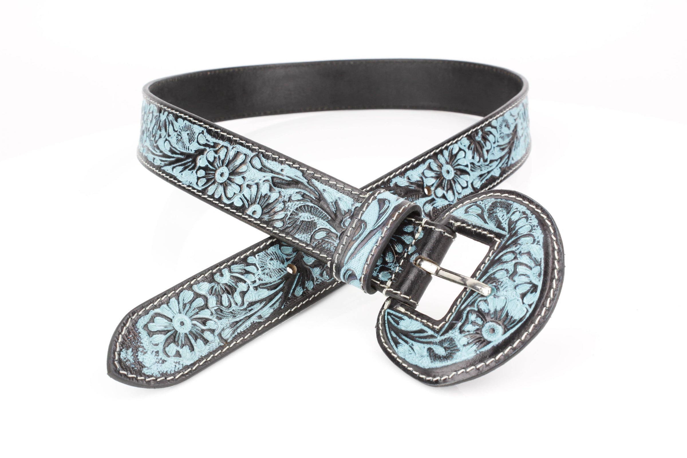 This Western-style leather belt showcases bold craftsmanship and vibrant design. The deep black leather base is enhanced with hand-tooled floral patterns in bright turquoise, creating a striking contrast that stands out. The buckle is fully covered in matching tooled leather with a coordinated floral design, ensuring a seamless finish. Secured with a sturdy metal prong, this belt offers both durability and authentic Western flair. A perfect accessory to add a colorful, statement-making touch to any outfit.