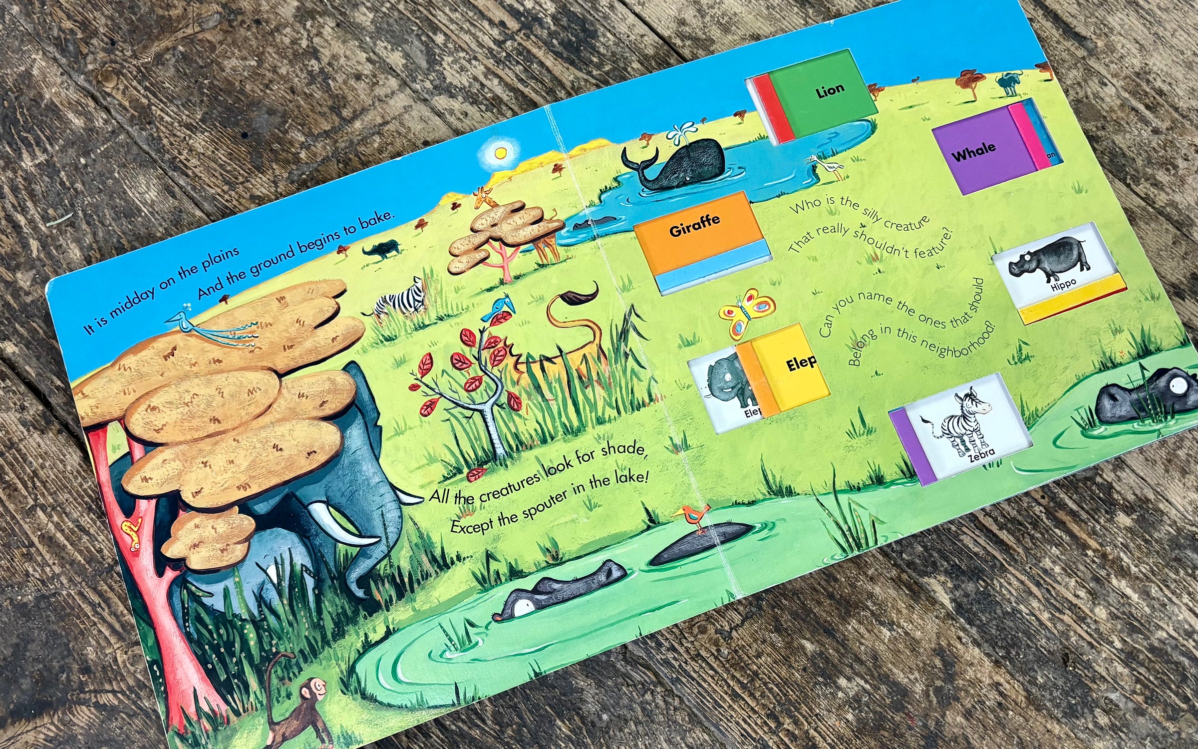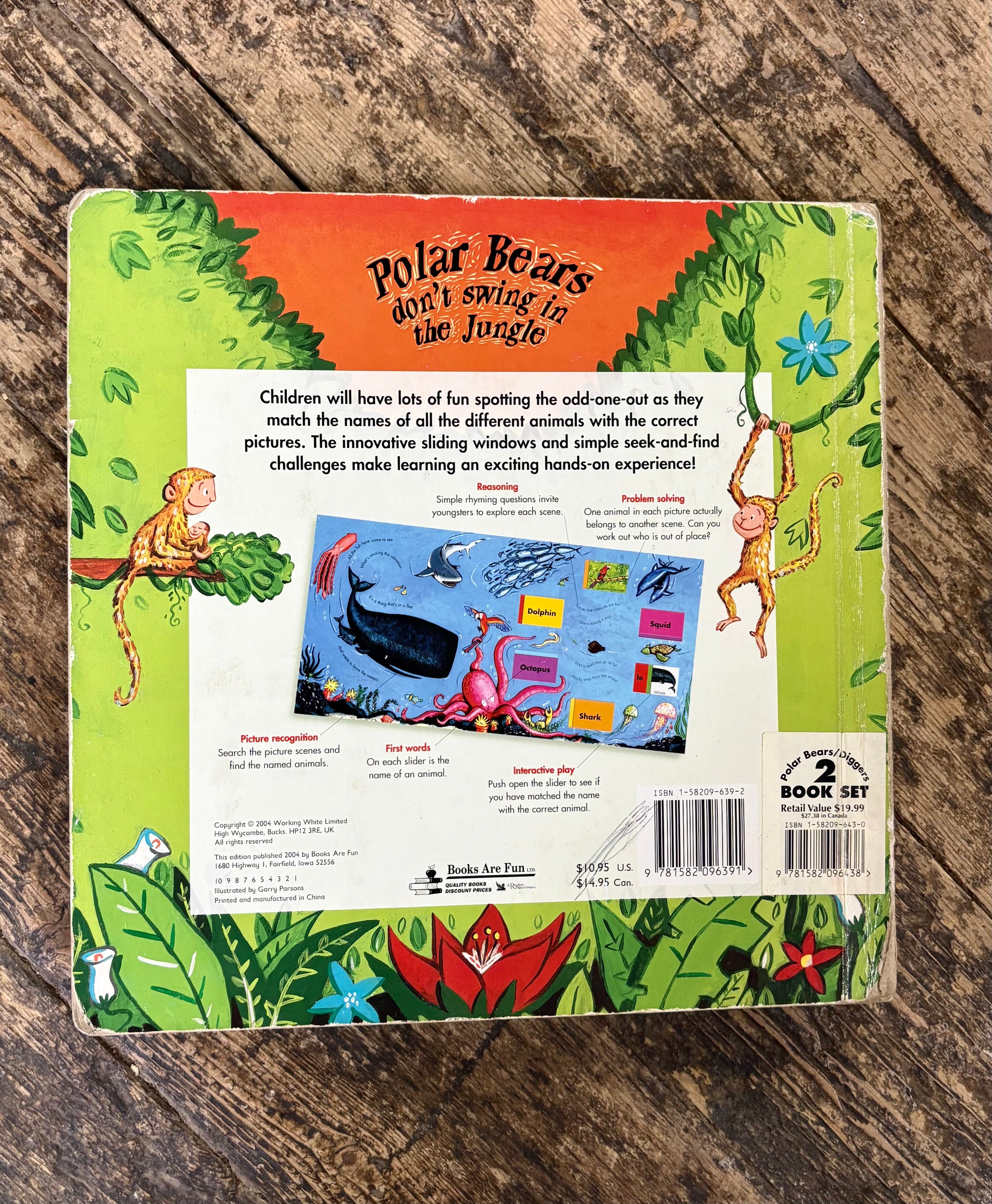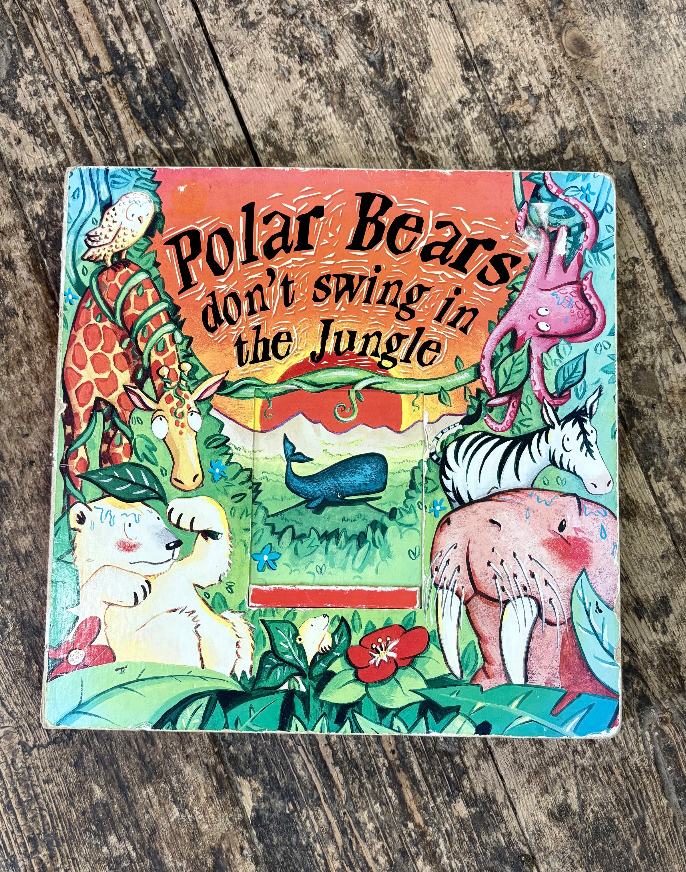 Vintage Polar Bears Don't Swing in the Jungle slide-up board book in very good condition. All sliders are in tack and move freely back and forth. Very good used condition.
