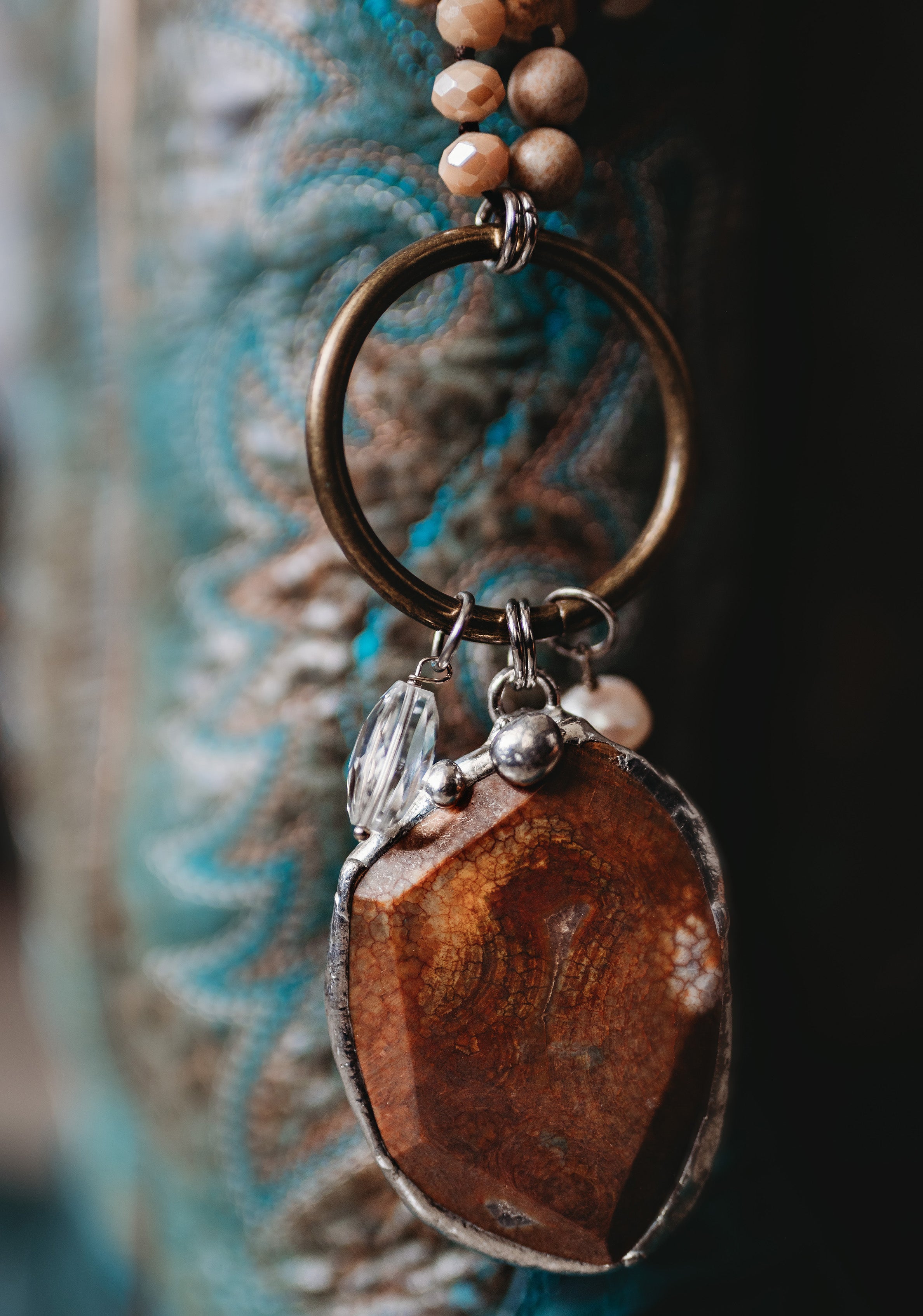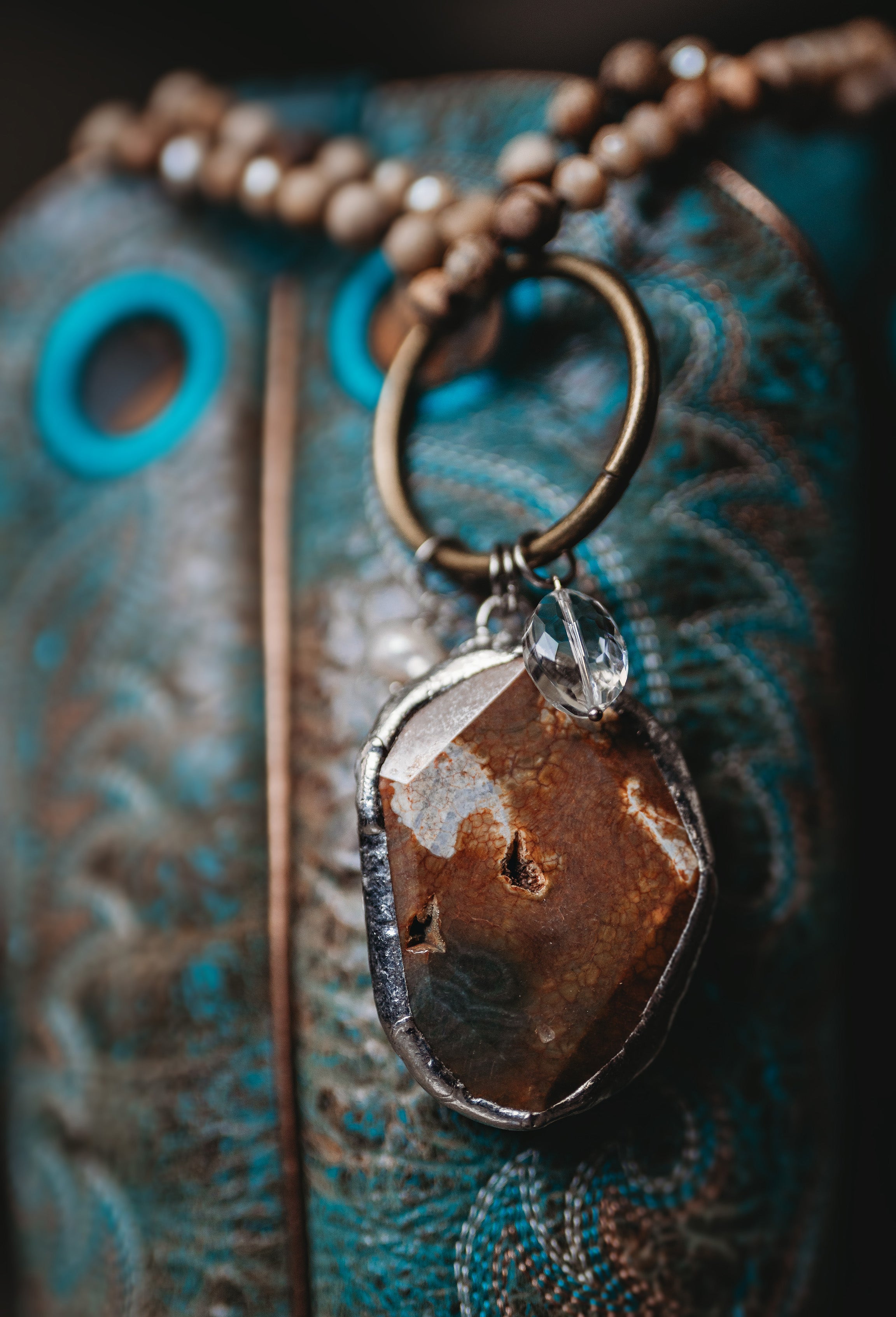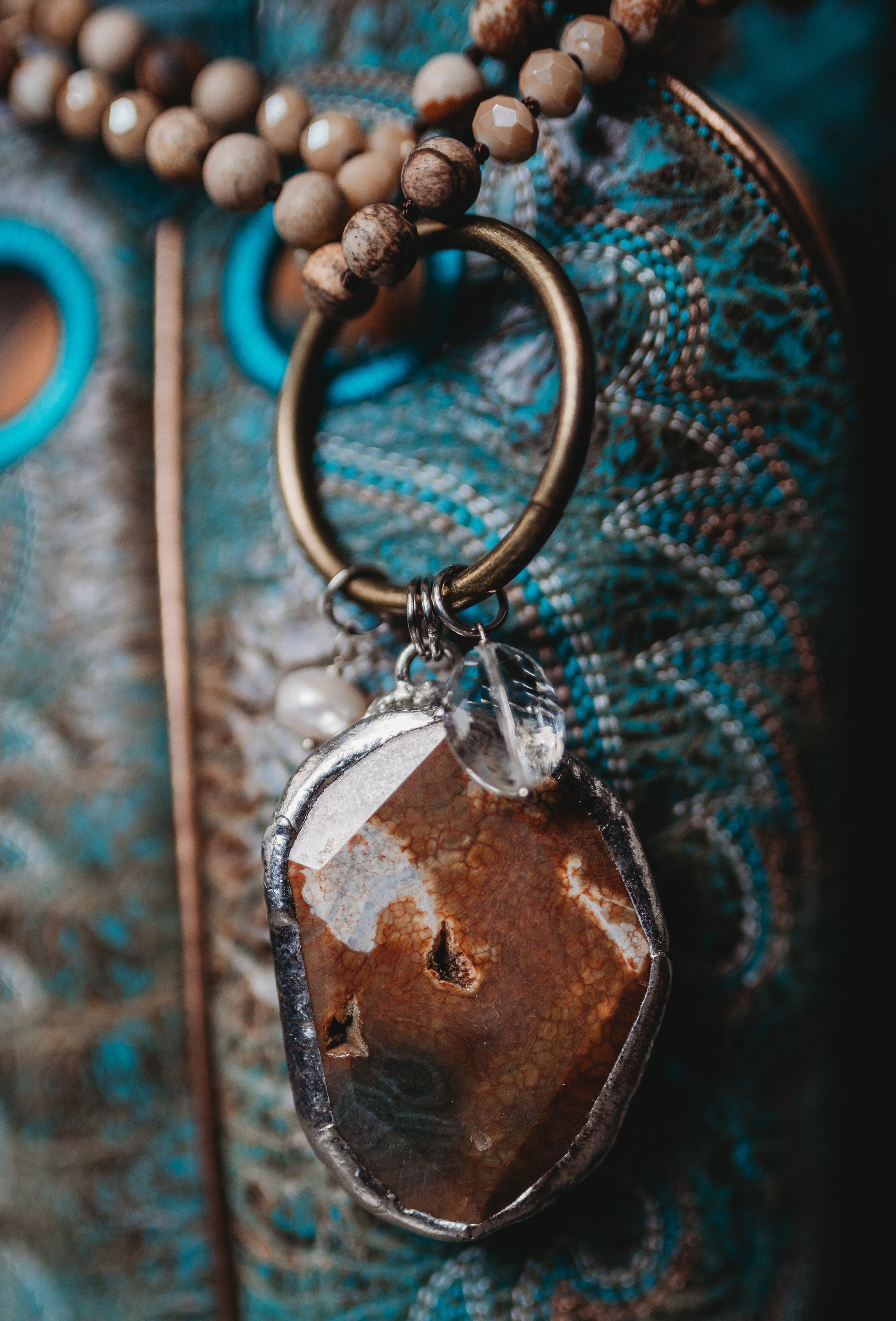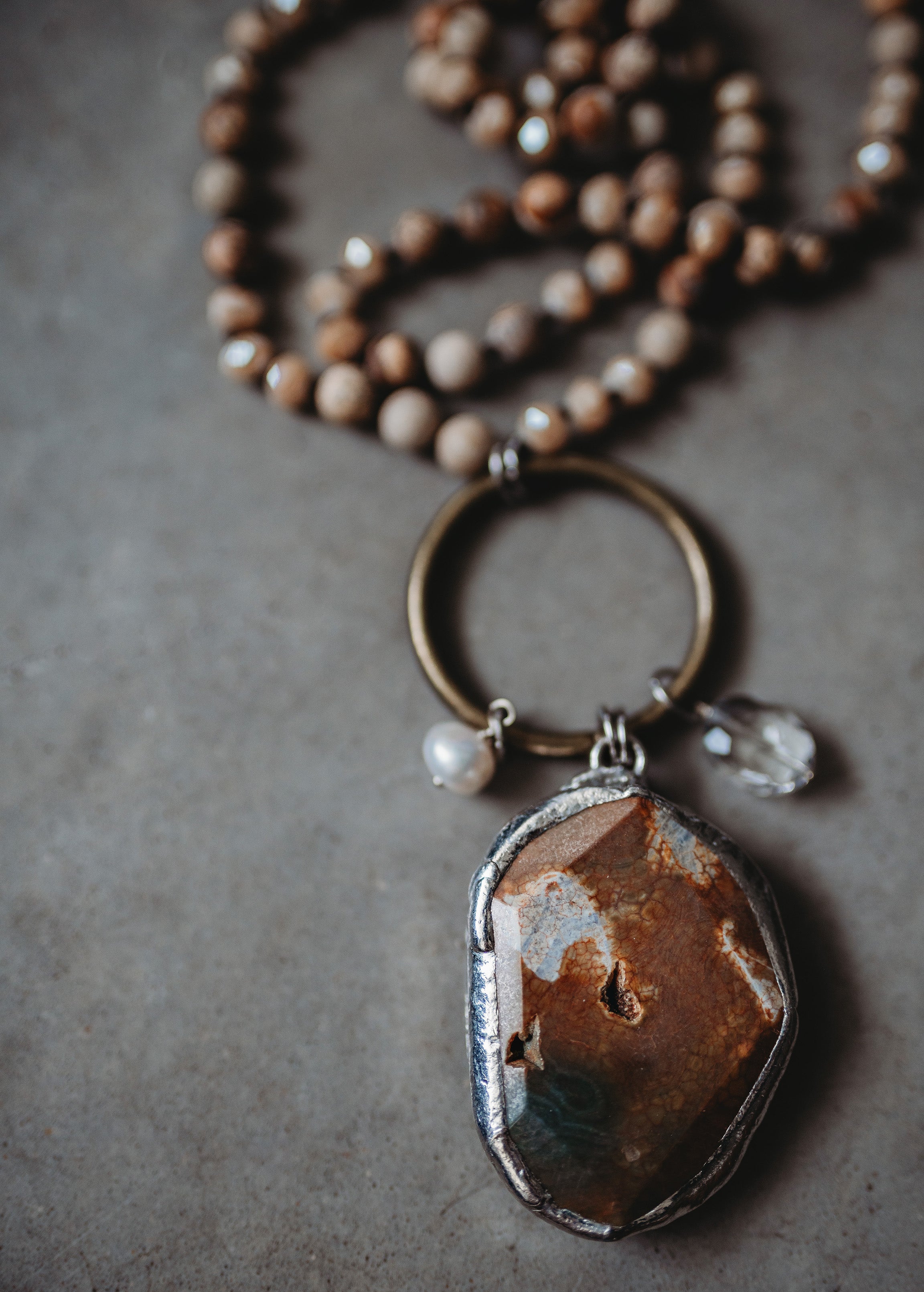 Agate stone necklace with soldered silver frame, foe pearl and crystal accents, natural brown and tan colored beads on 23" chain. Handmade in the USA, one of a kind piece
