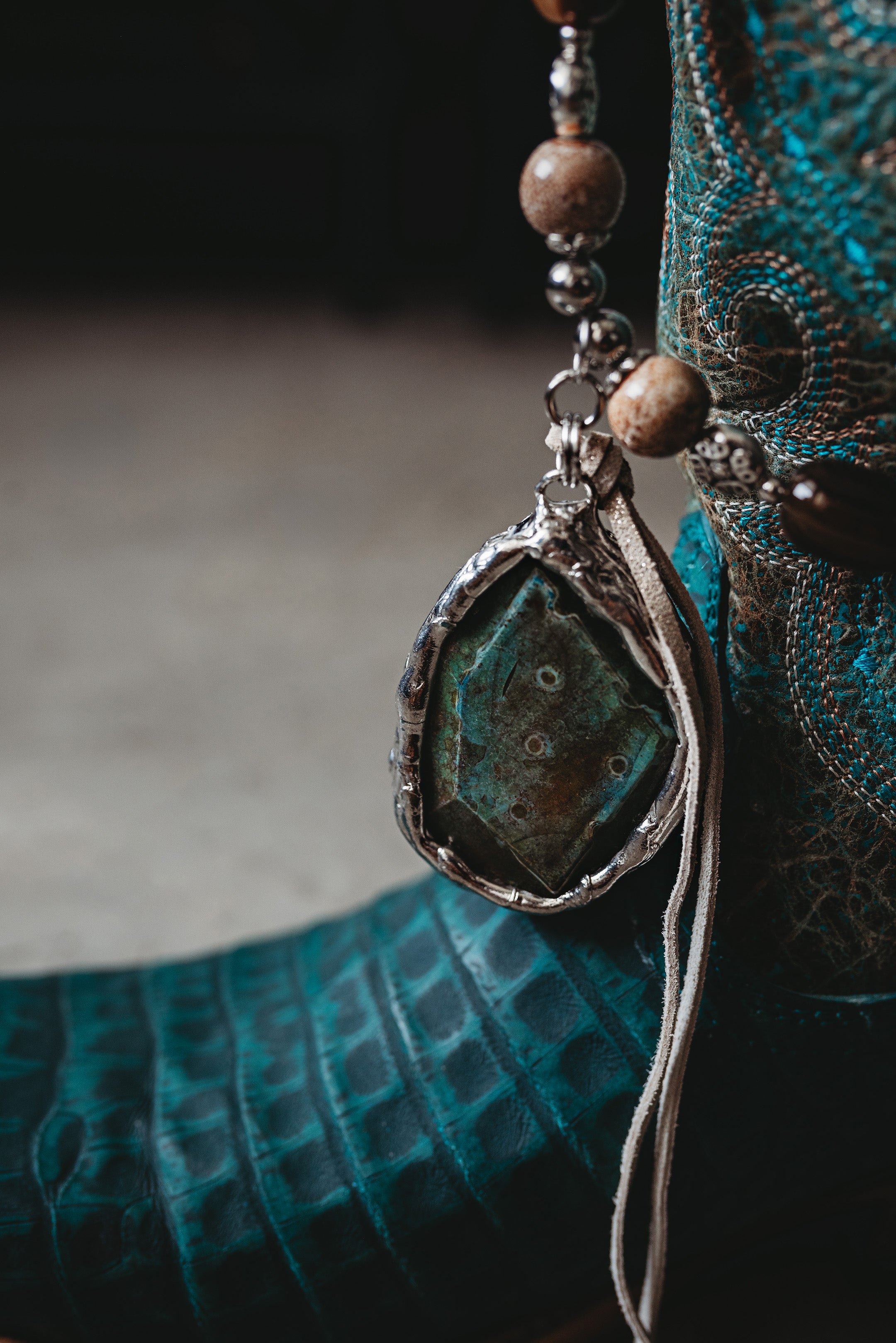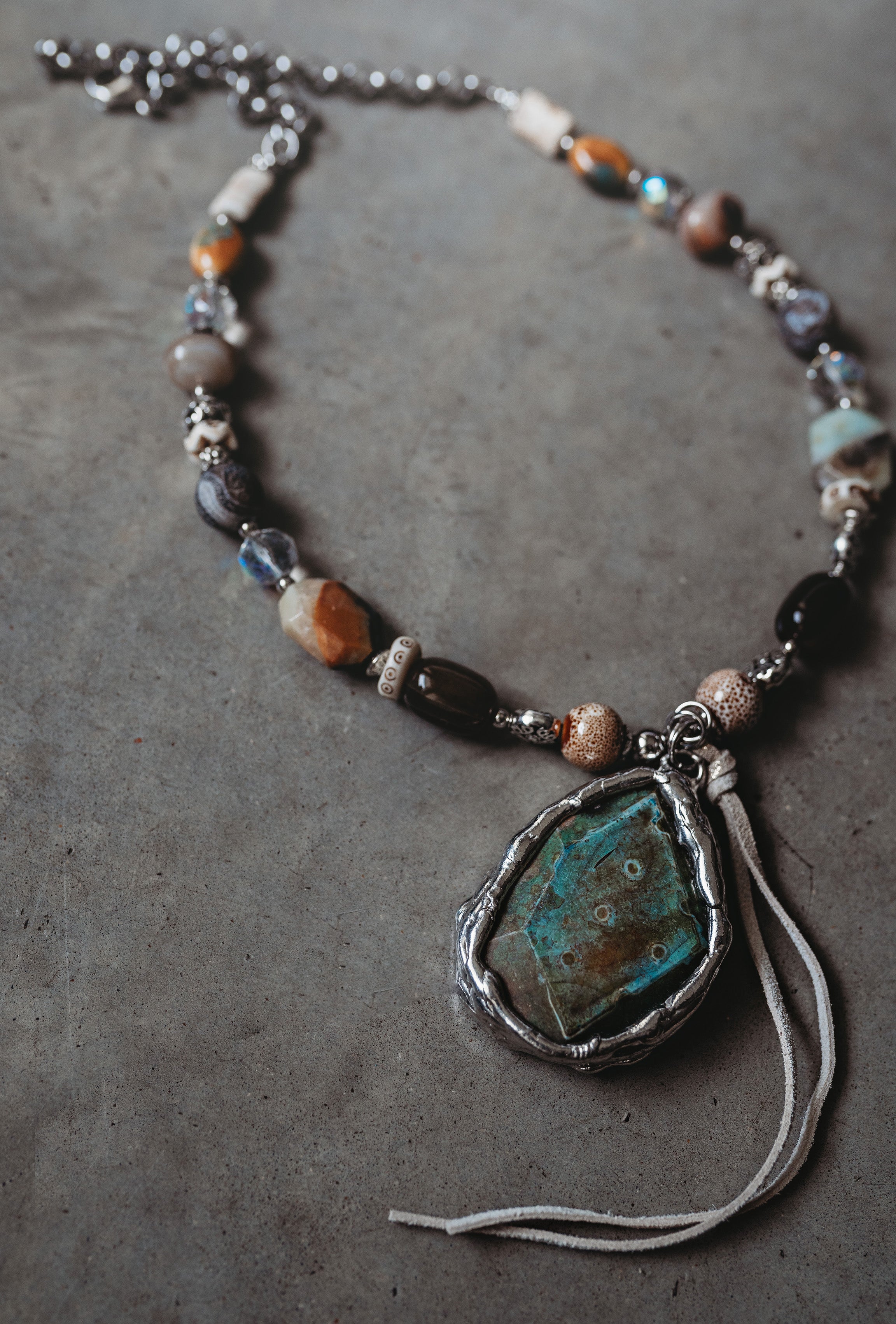 Ocean Jasper stone necklace with silver plated soldered frame, beaded 10" line and chunky closure clip. One of a kind, handmade necklace with shimmer tassel accent by stone