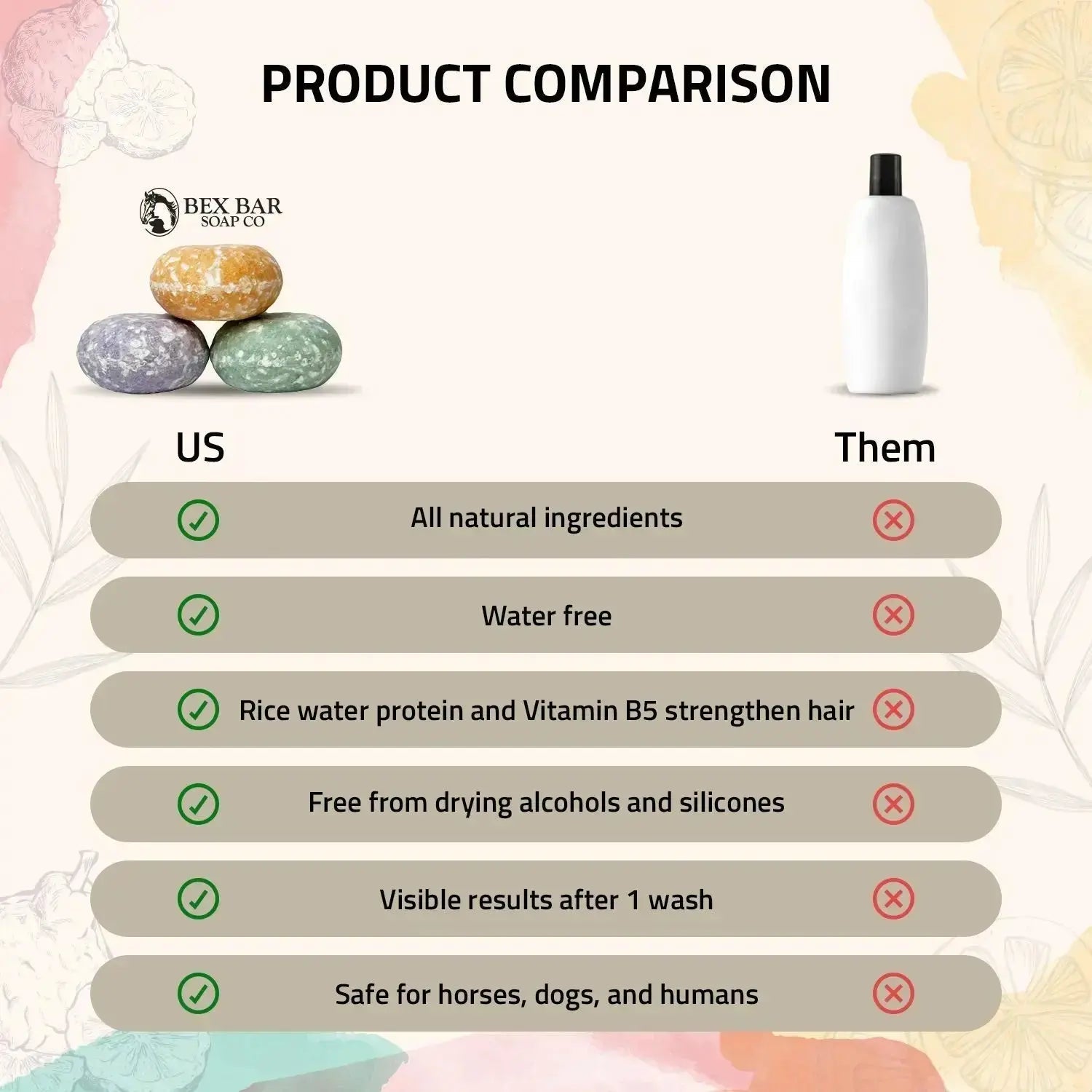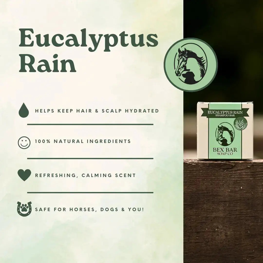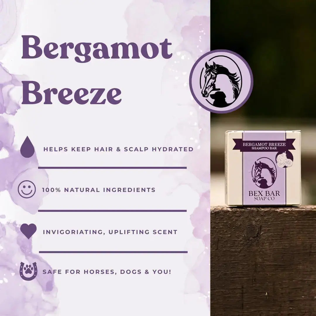 Our shampoo bar is the perfect solution for those looking for an eco-friendly and space-saving alternative to traditional liquid shampoo. Not only is it all-natural and conditioning, but it also helps conserve water and reduce waste. With easy rinsing and lathering, its cross-species use makes it a versatile addition to any household. Have one in the barn, in the dog's tub, and in your shower! Our shampoo bar avoids harsh chemicals and preservatives, using ingredients that not only nourish but are also good for the environment. Investing in our shampoo bar also means investing in sustainable living. Its compact size and long-lasting quality mean less packaging waste and a reduced carbon footprint. Each bar lasts for approximately 12-15 full horse baths, 20-30 medium sized, medium coated dog baths, or 60-70 medium length hair washes!