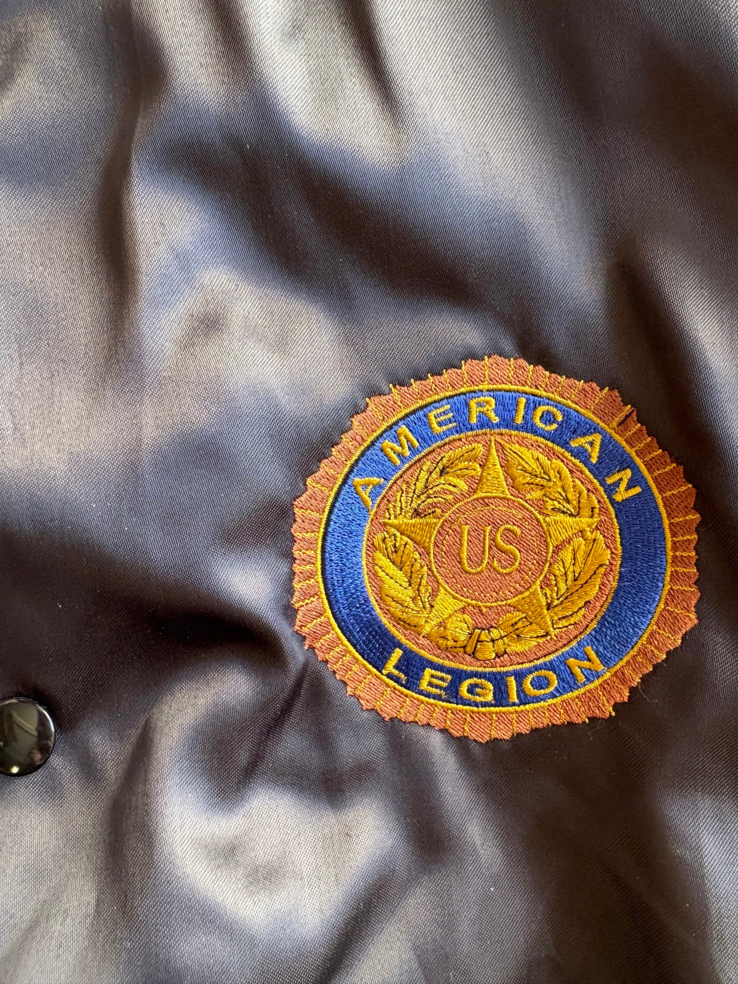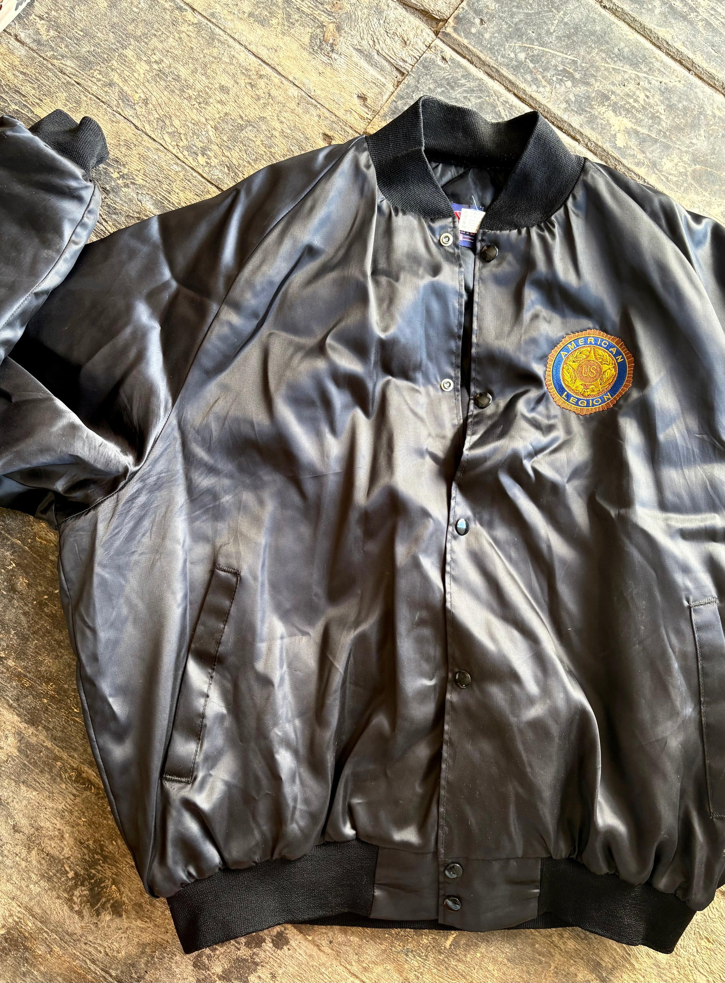American' Legion bomber jacket, black nylon with American Legion patch on breast. Black shiny nylon in color. Men's XL