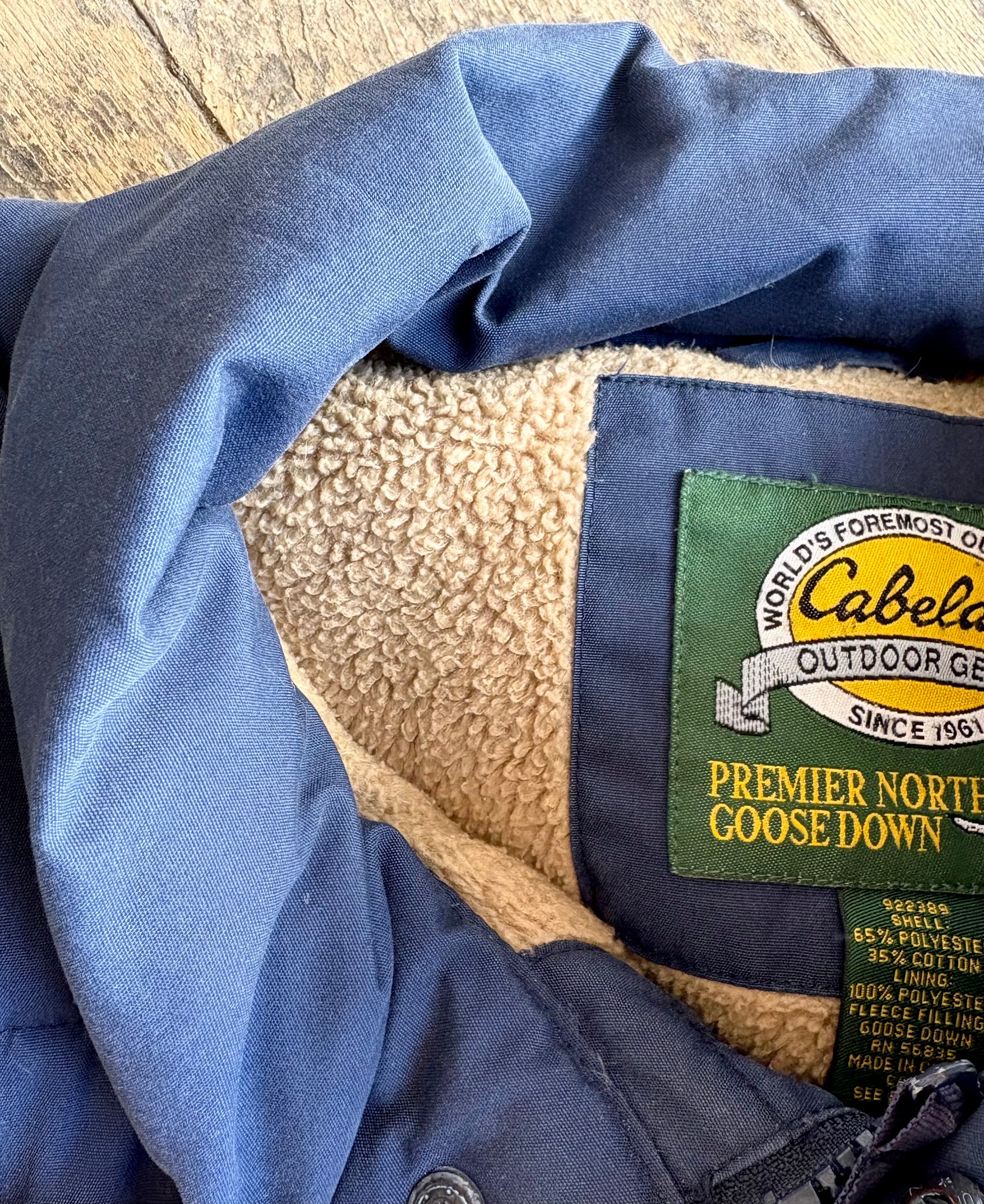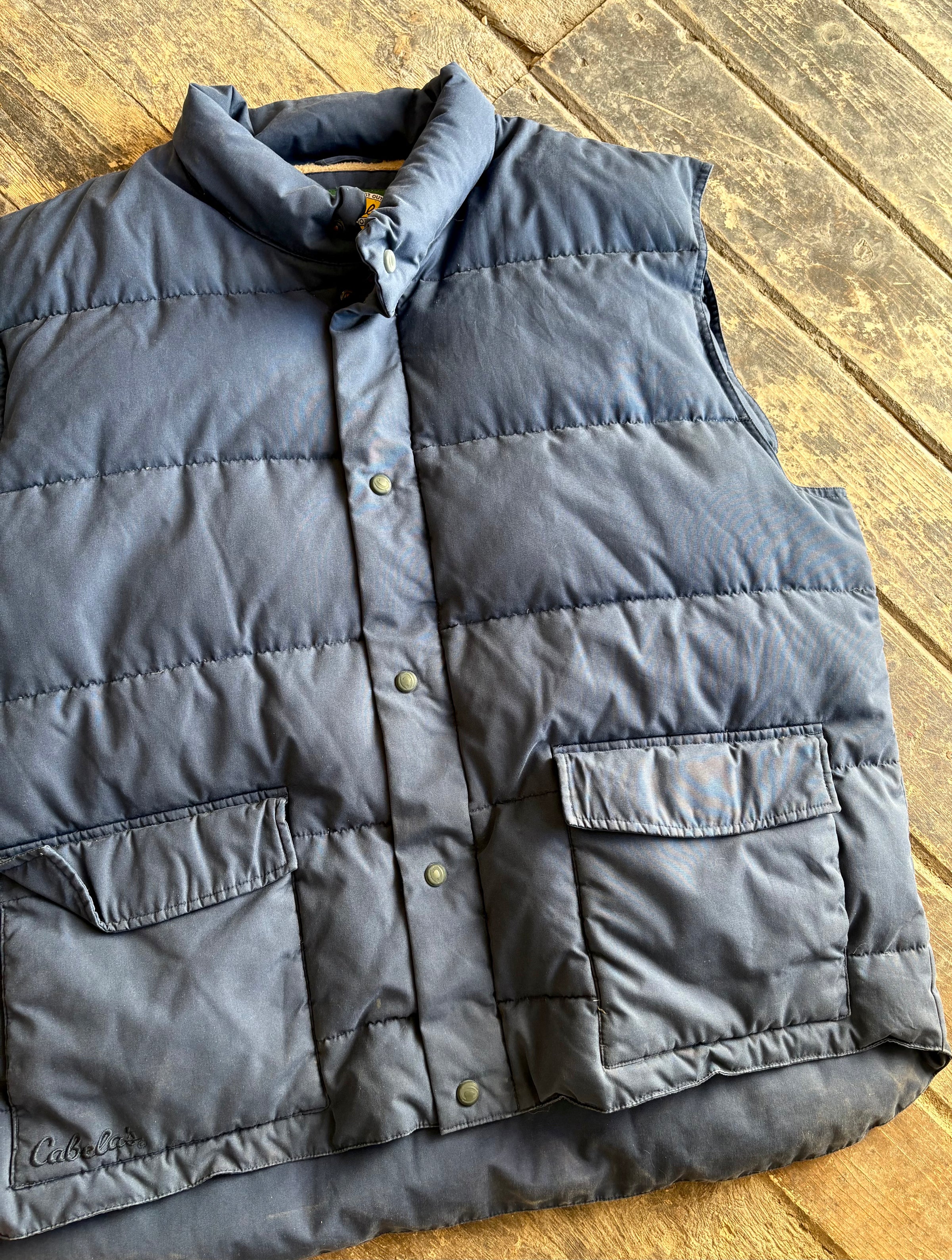 Cabela's men's good down button up vest. Light signs of wash wear. Navy in color with cream down interior. Men's size 2XL.