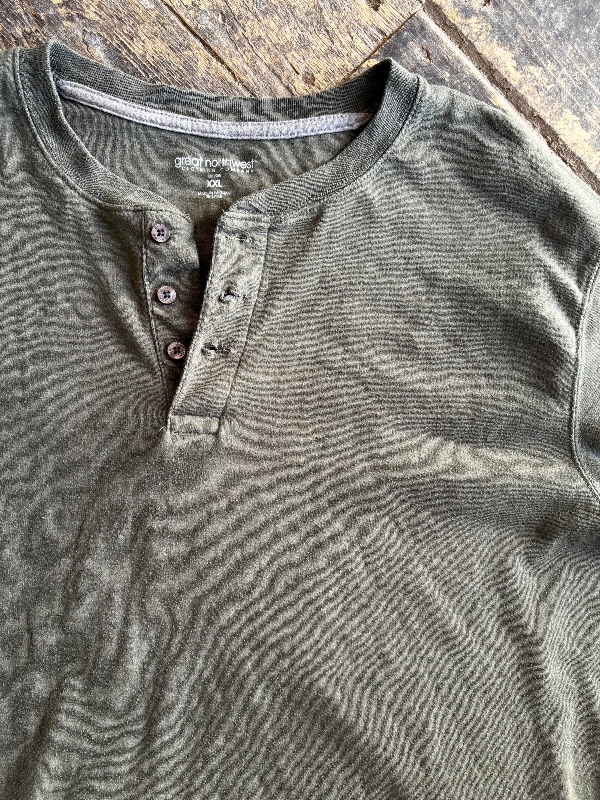 Great Northern olive green henley long sleeve tee with three button neck closure. Size XXL