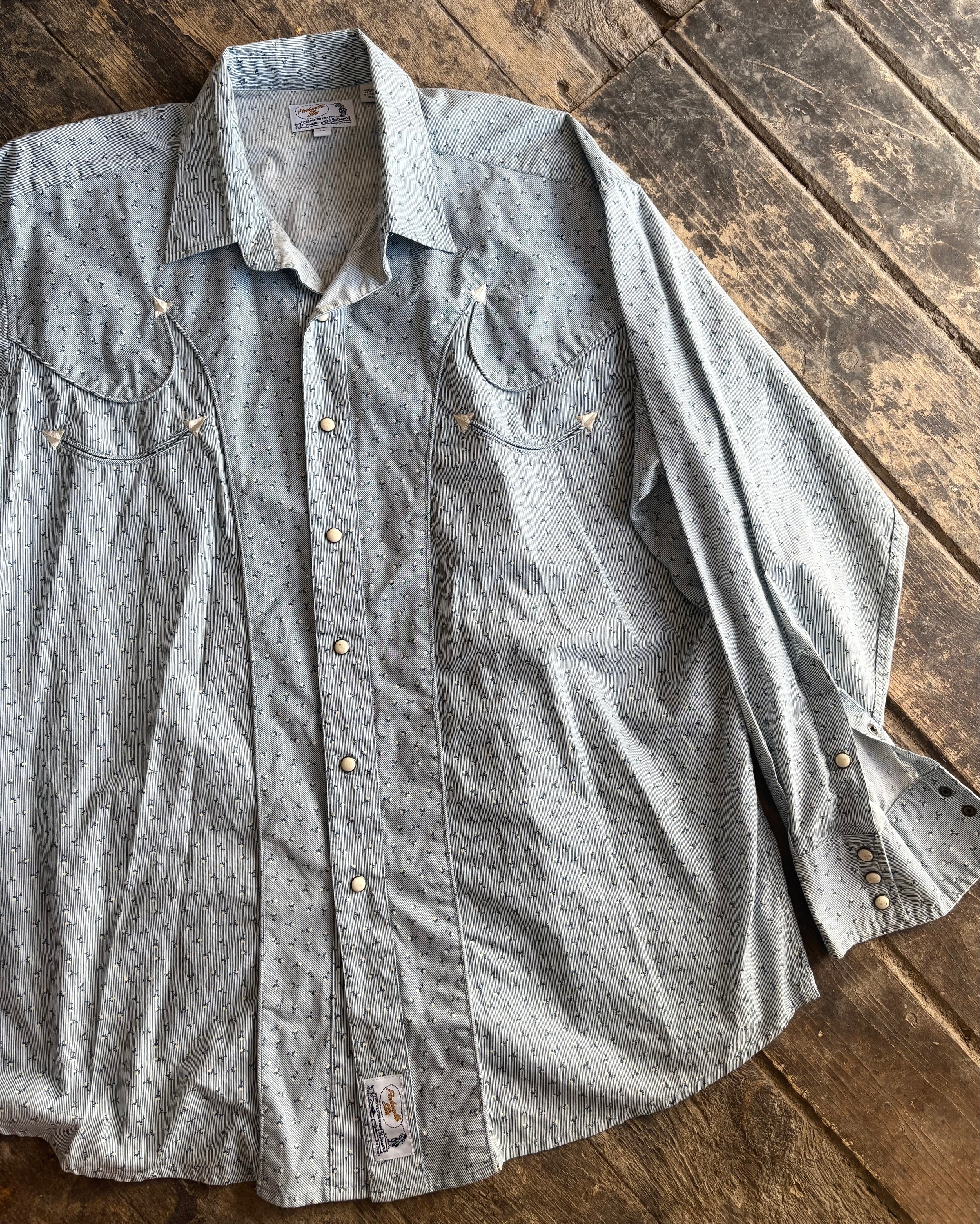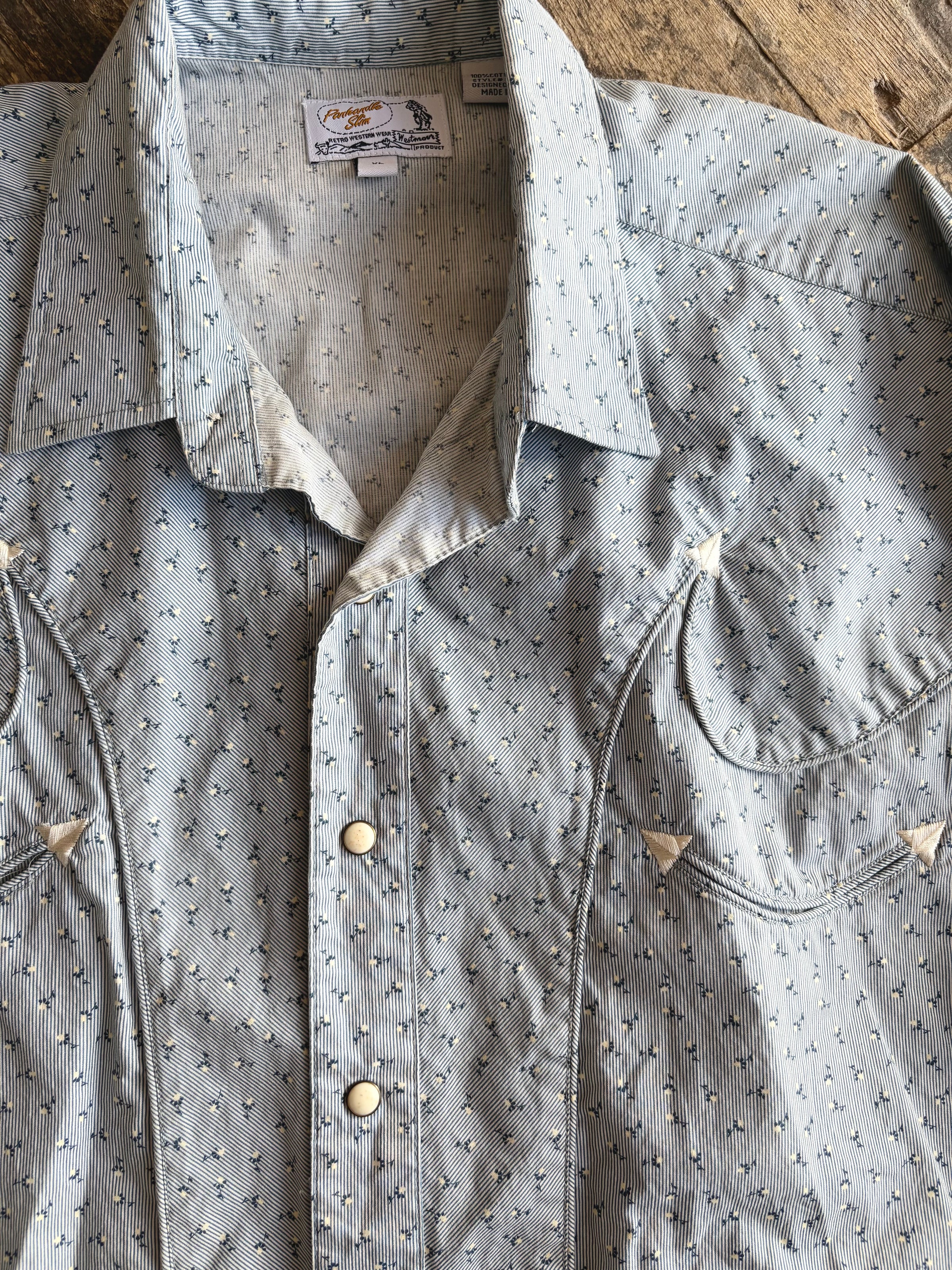 Panhandle Slim men's dress shirt with ivory-colored buttons, blue and white stripes with tiny floral pattern and breast pocket accents. Size XL