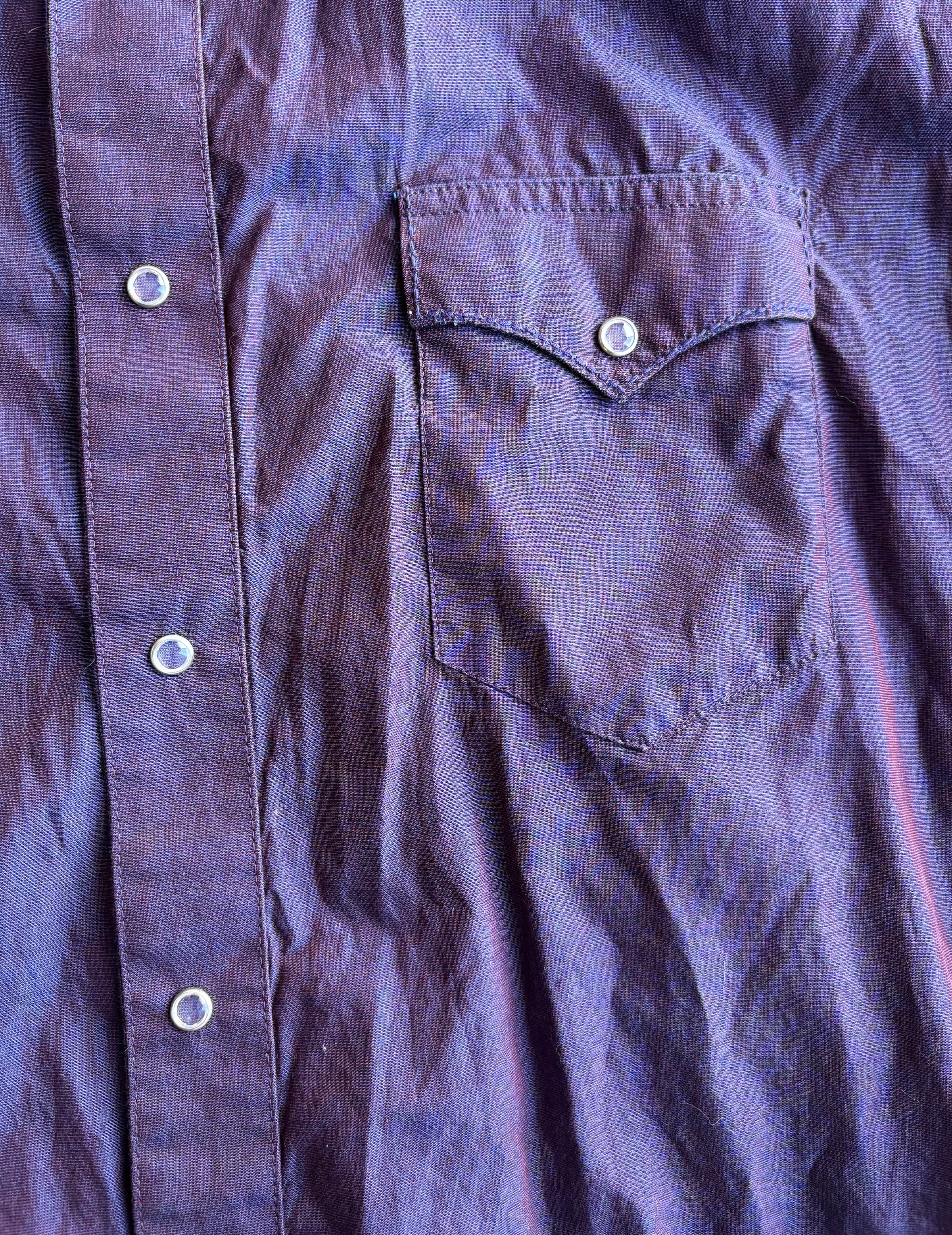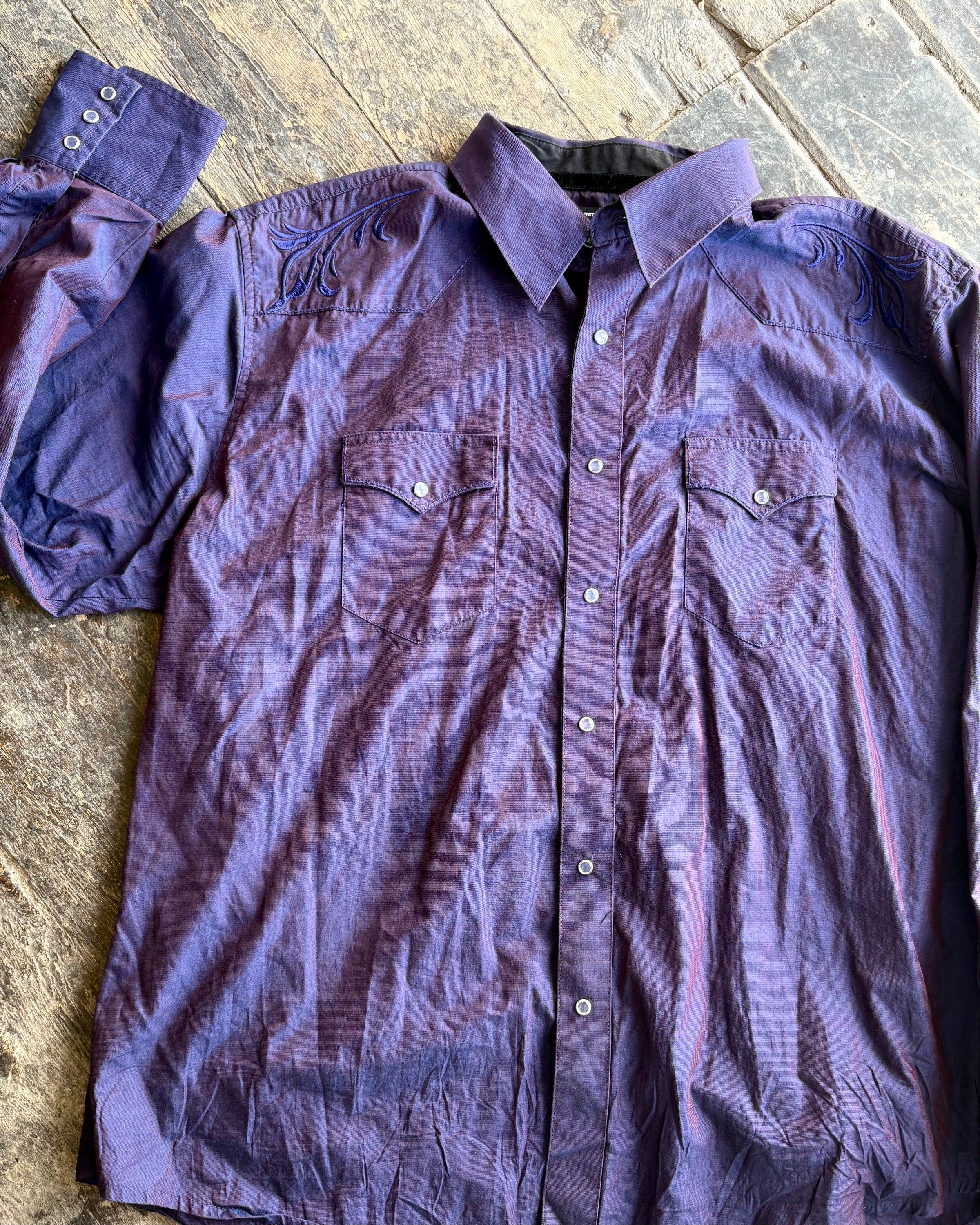 Wrangler's men's dress shirt, size XXL, shiny purple material with purple stitching and clear buttons.